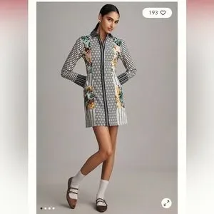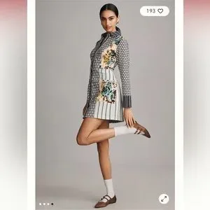 Stylish mini dress with a vibrant mix of patterns. Features floral and geometric designs. Long sleeves and a chic collar.