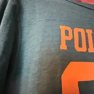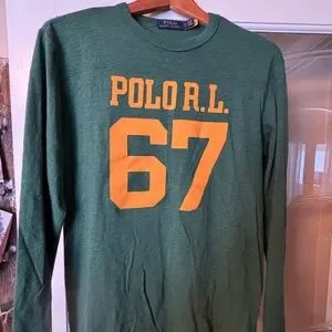 Classic green long sleeve tee with bold orange print. Features Polo R.L. 67 design. Ideal for casual wear.