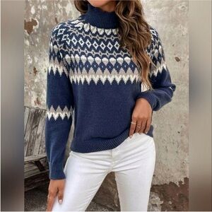 Navy Fair Isle Turtleneck Sweater Nordic Winter Knit Cozy Pullover NWT Medium