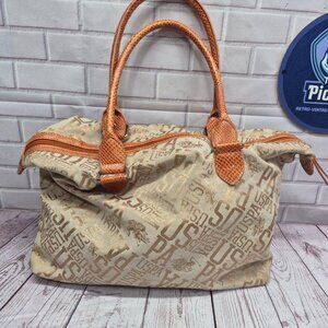 This US Polo Assn. handbag purse features a large size with a zip closure and double brown handles. The exterior is made of faux leather, vinyl, leather, and cotton with a natural tan color and logo graphics depicting a horse. The interior includes inner pockets and is lined with polyester in a tan color. The silver hardware accents the classic style of this shoulder bag, making it a stylish and practical accessory for women.