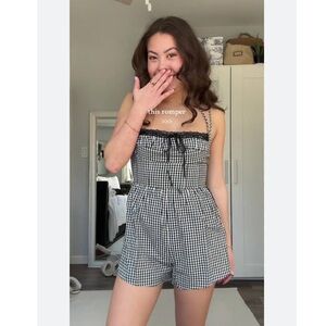 Brand new, never worn, store display. Part of store tag still attached. Dainty lace trim gives a cute vibe to this fluttery cotton romper with a sunny gingham pattern all over.