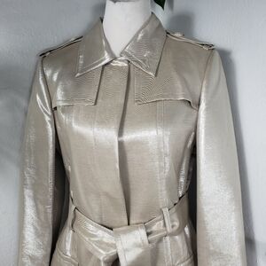 St. John Shimmering Silk Trench Tan / Silver w/ Belt & Pockets Couture sz 10
