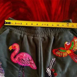 Fly high in style with these playful sequin-embellished shorts from Queen of Sparkles. The Take Flight Multi Bird Shorts feature a stunning flock of tropical birds—including a flamingo, toucans, and a parrot—crafted in vibrant sequins for that signature sparkle.