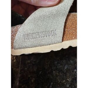 Keywords: Birkenstock, thong sandals, gold sandals, women's sandals, size 7, size 38, casual footwear, summer sandals, adjustable buckle, flat heel, pre-owned sandals, light wear, synthetic material, high-quality construction, ladies sandals.