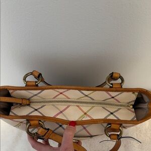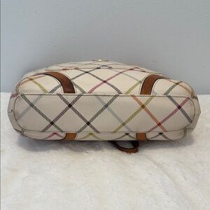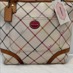 Elegant Coach tote with a plaid pattern. Features tan leather accents. Ideal for daily use.