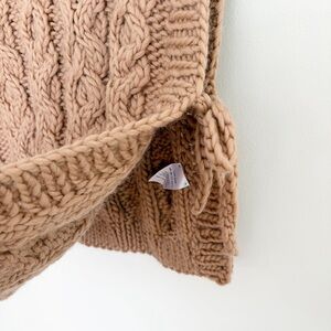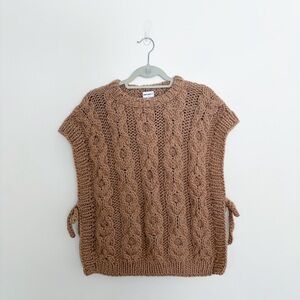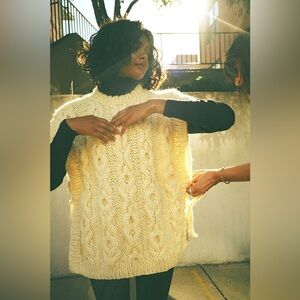 Tabard style vest with two handknit square panels and side ties. Fabric is 100% wool. Approx. 22” length