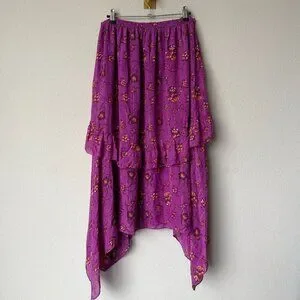 Ulla Johnson 'Torri' magenta floral handkerchief skirt. Made from silk-blend lightweight fabrication, featuring a flowing handkerchief hem, tiered ruffle detailing, and an allover floral print in rich purple tones. Lightweight and airy, with a side zipper closure. Size 8 - 15" waist; 40" length at longest point.
