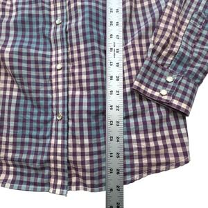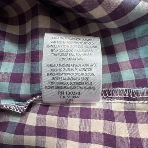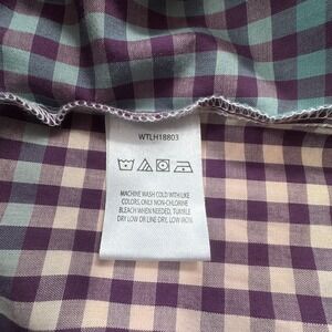 Wrangler western long sleeve shirt features a purple, teal, cream gingham plaid check pattern, pearl snaps, 2 chest "spade" pockets with snap down flaps, pointed western yoke, and 2 snap cuffs. Flattering tailored fit with a curved hemline that looks great tucked in or left out.