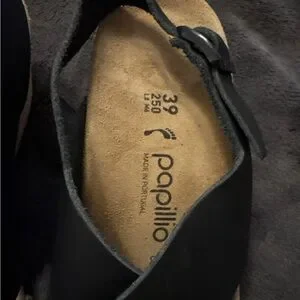 NWOT Papillio Black Leather "Samira" Wedge Sandals, Size 39, Narrow Width.