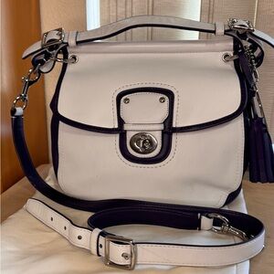 This 2013 Large Willis is part of Coach’s highly sought-after legacy reissue collection — crafted in smooth, glove-tanned leather with the structured silhouette that made the original Willis iconic. The crisp white body paired with deep purple trim gives this piece a refined yet distinctive look that stands out beautifully from the more common solid versions.