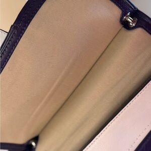 This bag is exceptionally clean and very well cared for. Leather remains supple and structured, hardware is bright, and corners show minimal wear. It includes the original crossbody strap, leather hangtag, metal hangtag, and tassels — a full set that collectors love to see. There are two tiny spots on the front, and two white marks on the purple, one on strap and one on the bottom edging of the front. Can be seen in photos.