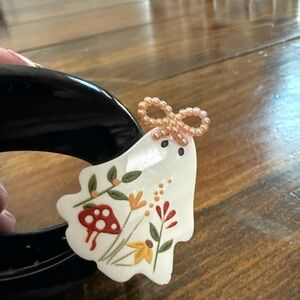 Stylish black hair clip featuring a cute ghost charm with floral and mushroom design.