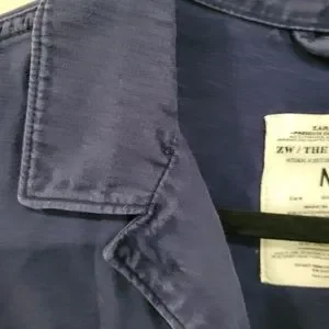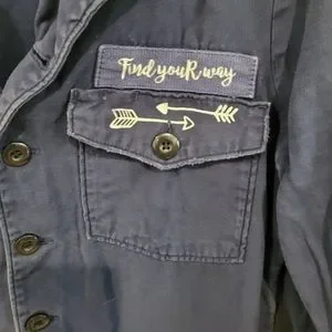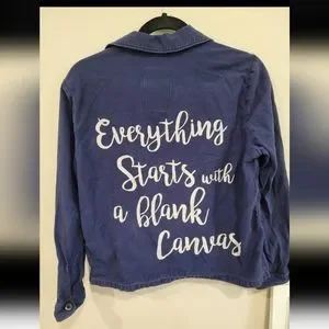 ZARA "Find Your Way...Everything Starts With A Blank Canvas" button up, shirt or light jacket. Blue with white lettering graphic. Light distressing, Two chest pockets, 100% heavy cotton. Military style with long sleeves and button cuffs. Nice as a shirt or layer piece. Fun piece.