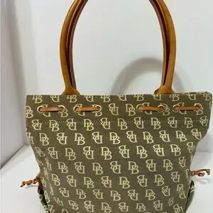This tote features the signature Dooney & Bourke monogram pattern in brown and tan on a canvas exterior.