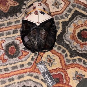 Von Dutch cap featuring striking graphics. Beige front with black mesh back. Eye-catching design.