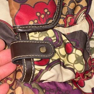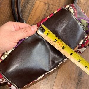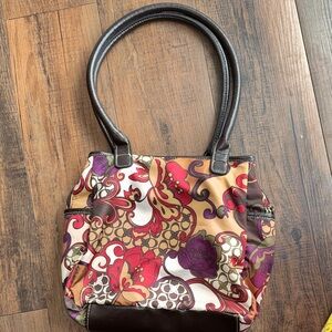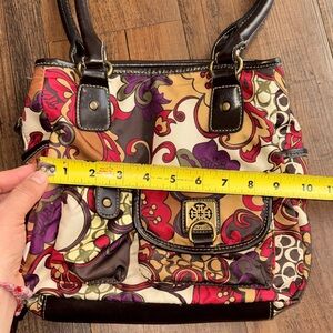This vibrant shoulder bag features a stunning floral design in rich red, purple, and brown tones. Perfect for adding a pop of color to any outfit.