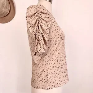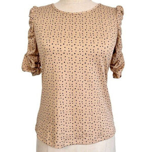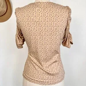 Keywords: Jules & Leopold, Women's Top, Half Sleeve, Ruched Detail, Size Small, Nude Pink, Polka Dot, New, Feminine, Elegant, Flattering Fit, Lightweight, Versatile, Playful, Timeless, Quality, Brand-New.