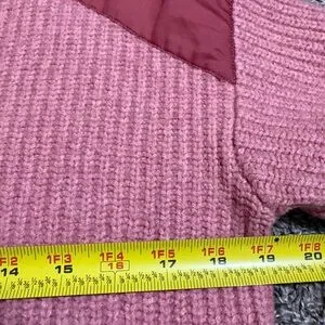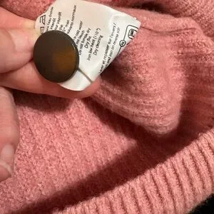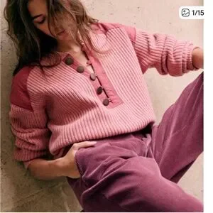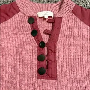 Stylish pink wool sweater with quarter button design.