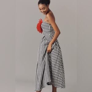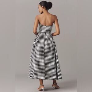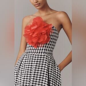 The Mac Duggal Strapless A-Line Midi Dress stuns in houndstooth bouclé with a statement organza floral embellishment at the bust for a bold, textural twist.