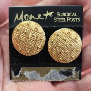 Monet classy career Signed Round pierced earrings with a textured geometric pattern. Features surgical steel posts.