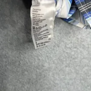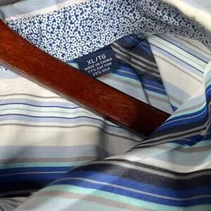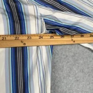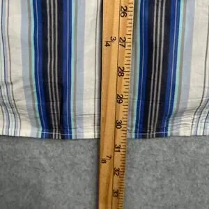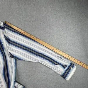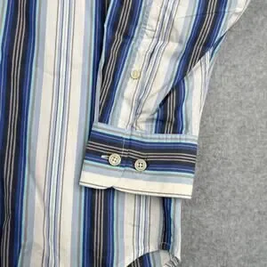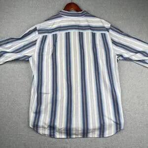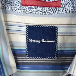 This Tommy Bahama XL blue striped silk blend button-up shirt is perfect for a casual occasion or party. Made with a luxurious silk and cotton fabric, it features a collared neckline, long sleeves, and a point collar style. The Hawaiian beach theme adds a touch of fun and flair to the shirt, making it a versatile piece for all seasons. The regular fit and XL size ensure a comfortable and stylish look for any man's wardrobe.