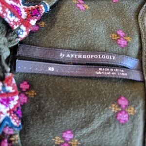 This chic Anthropologie top features vibrant patterns in green and red hues, perfect for adding a stylish element to any wardrobe.