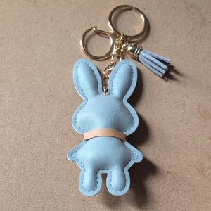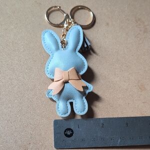 This delightful gray bunny keychain features a cute tan bow, perfect for adding a playful touch to your child's bag.