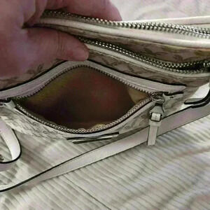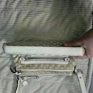 Dana Buchman crossbody purse. Brown, cream, & white. white adjustable strap. silver hardware. several pockets.