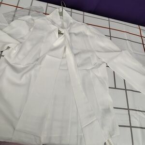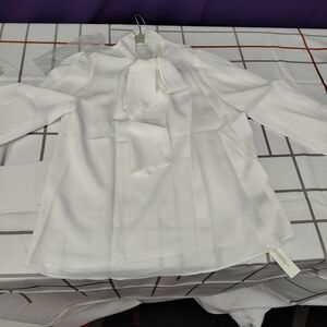 Elegant white blouse with a bow tie neck and long sleeves. Perfect for office wear.