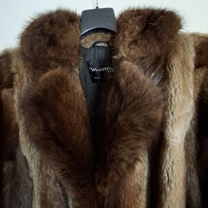 Beautifully maintained vintage full-length fur coat from the renowned Marten's Furs (Toronto/Oshawa). This coat is crafted from high-quality muskrat pelts using a "let-out" technique that mimics the sleek, vertical flow of mink.