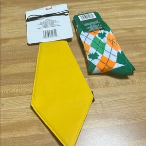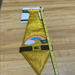 Sparkling gold glitter tie with rainbow and shamrock design. Includes orange and green shamrock socks.