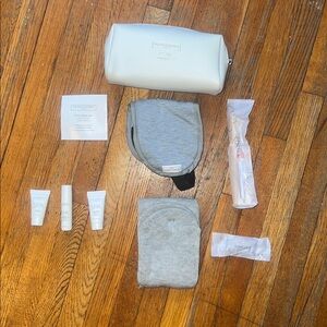 Elegant accessory set from The White Company. Includes a white pouch, spa lip balm,moisturizer, gray sleep mask, earplugs and gray socks. Perfect for travel or relaxation.