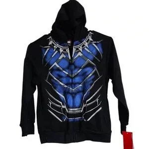Marvel Black Panther zip-up hoodie for kids featuring a bold blue and silver armor-style graphic inspired by the iconic superhero suit. Perfect for everyday wear, school, or costume-inspired outfits.