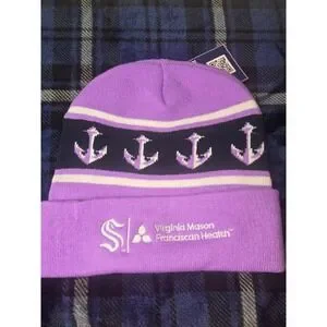 Official Seattle Kraken Hockey Fights Cancer knit beanie commemorates the team's partnership with Virginia Mason Franciscan Health. This purple cuffed hat features a striking anchor pattern across the crown, accented by white stripes and a navy blue band. The front cuff is detailed with high-quality embroidery of the Kraken Hockey Fights Cancer logo and ribbon, while the back displays the team's secondary logo alongside the healthcare partner branding. Constructed from soft, warm acrylic, this collectible piece is perfect for chilly game nights at Climate Pledge Arena or showing support for a great cause during the NHL season.
