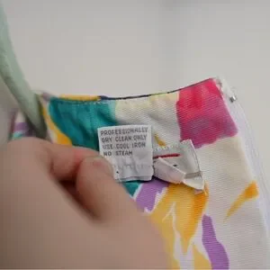 Authentic vintage 1980s Talbots women’s dress in size 8 featuring a bold watercolor floral print in teal, purple, yellow, and pink on a white background.