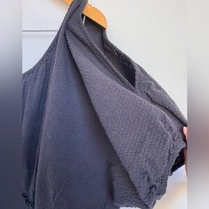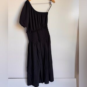 This one shoulder dress has a single short sleeve with a slit across the shoulder and elastic cuffing. It has a smocked waistline and ribbed knit throughout.