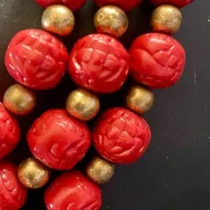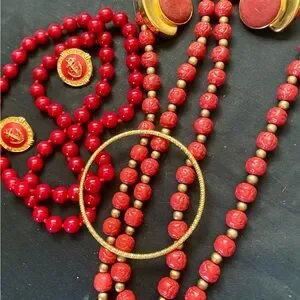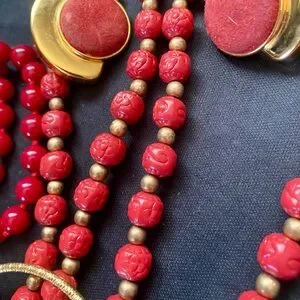 Vintage Carved Red & Glass Beaded Necklaces with gold accents earrings