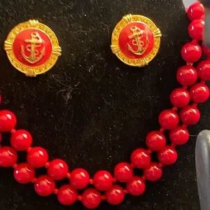 This stunning red beaded necklace and earring set adds a touch of elegance to any outfit. Perfect for any occasion.