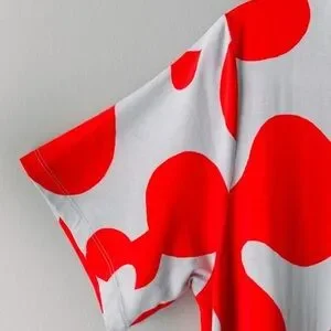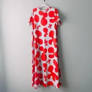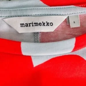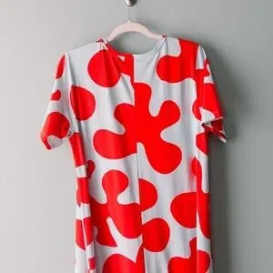An absolutely stunning color way with a bold, eye-catching print on a simple A line t shirt dress with crewneck. EASY and COMFORTABLE to wear while making a statement. This pattern is RARE and hard to find.100% cotton Size LargeColors: Ice Blue with red abstract designShort sleeveMaxi dress lengthBrand: MarimekkoCondition: Preowned, EXCELLENT Condition, seemingly unworn