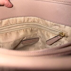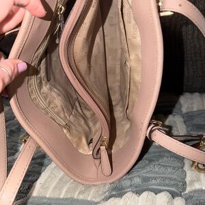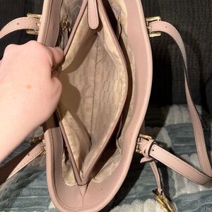 Elegant pink tote bag featuring stylish gold accents. Perfect for everyday use with a chic design. There’s also a matching wallet in my closet.