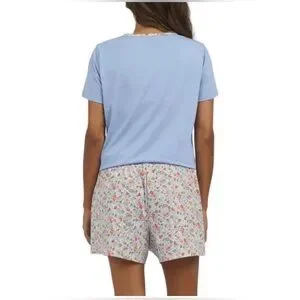 Soft knit pajama set with blue top and floral shorts. Ideal for cozy nights.