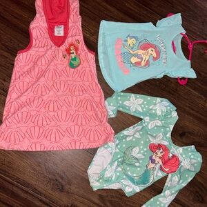 Adorable Ariel themed clothing set for kids. Includes a pink sleeveless top, a light blue dress, and a green long-sleeve swimsuit. Perfect for little fans of the sea princess.