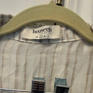 Elegant cream dress with subtle stripes. Features long sleeves and a stylish wrap design.
