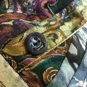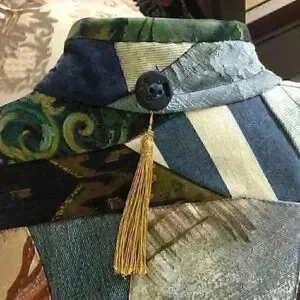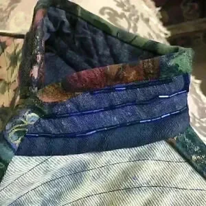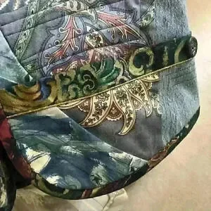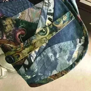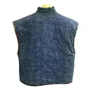 One of a kind designer piece Patchwork on one side and denim on the other Open front High neck with beads Front pockets with button accent In excellent vintage condition One size Shoulder 19" Pit to pit 19.5" Length 21"