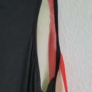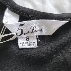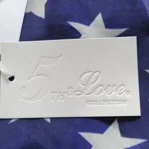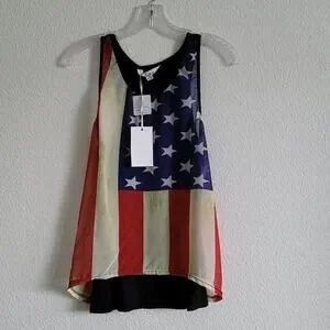 5TH & LOVE COLLECTION American Flag stars and stripes semi sheer sleeveless tank top. High low hem. Front of tank is semi sheer material. Back is black t-shirt material with stretch. Scoop neck. There are traces of green on the light part of shirt that are part of the design. Loose fit.
