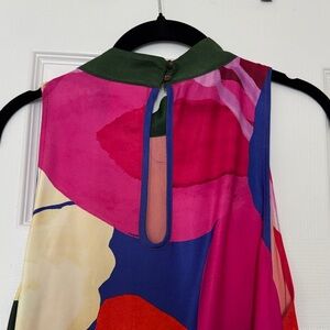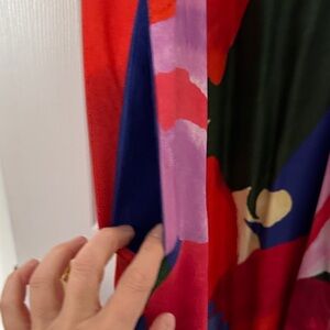 This vibrant sleeveless dress features a stunning floral design in red, pink, and green hues. Gorgeous florals and sophisticated halter mock neck. Super flowy. Perfect for any occasion, it offers a stylish and comfortable fit. Women Size L. Amazing condition gently worn. Smoke free and pet free home.