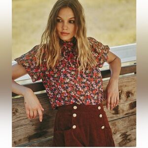 Chic floral blouse with ruffle sleeves. Features vibrant multicolor design. Ideal for stylish outings.