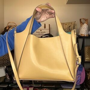 Rare and eye-catching Stella McCartney Disney collaboration tote featuring perforated circular logo detail and Mickey graphic. Soft structured silhouette in buttery yellow vegan leather with adjustable crossbody strap and matching detachable pouch.