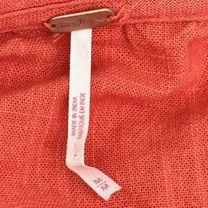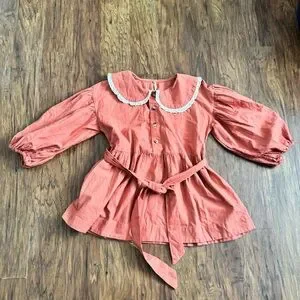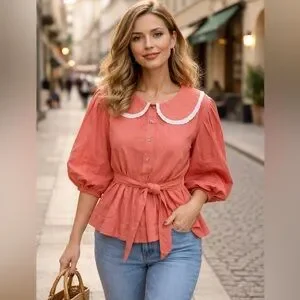 Free People Porto Top, which is a rust-orange cotton blouse featuring puff sleeves, a button-front closure, and a lace-trimmed Peter Pan collar.