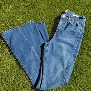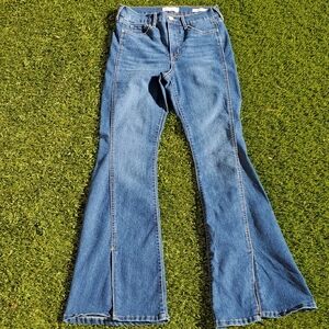 Step out in style with these open slit, high rise flare jeans. Perfect for adding a trendy touch to your wardrobe. see pics for minor pilling. measurements in photo
